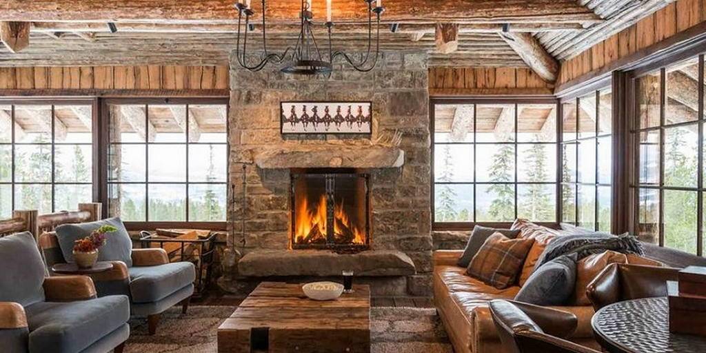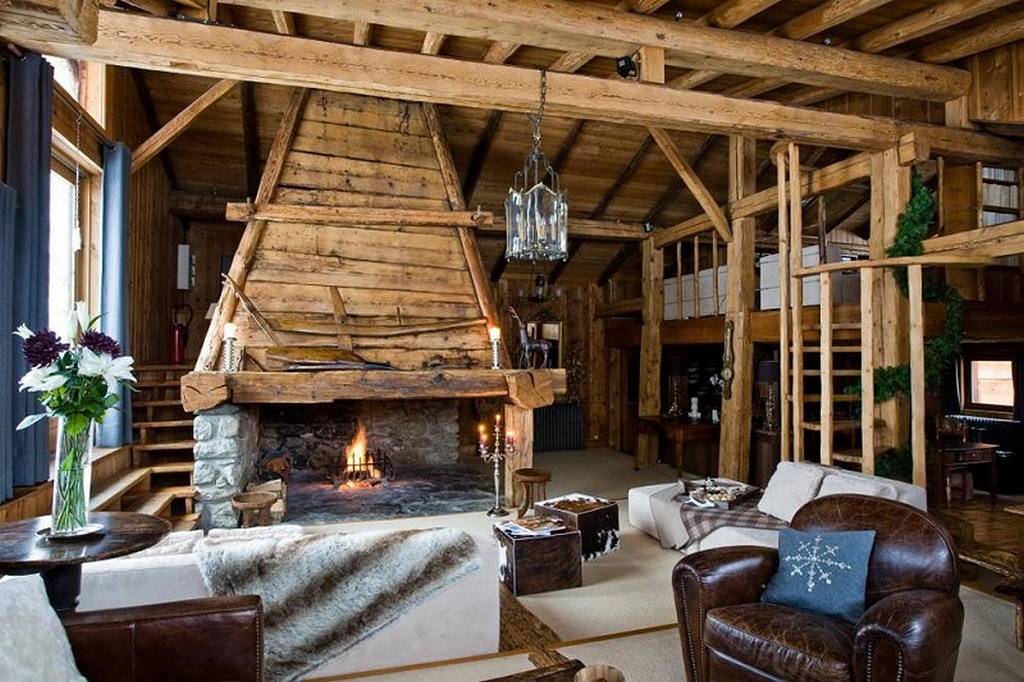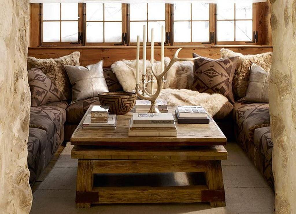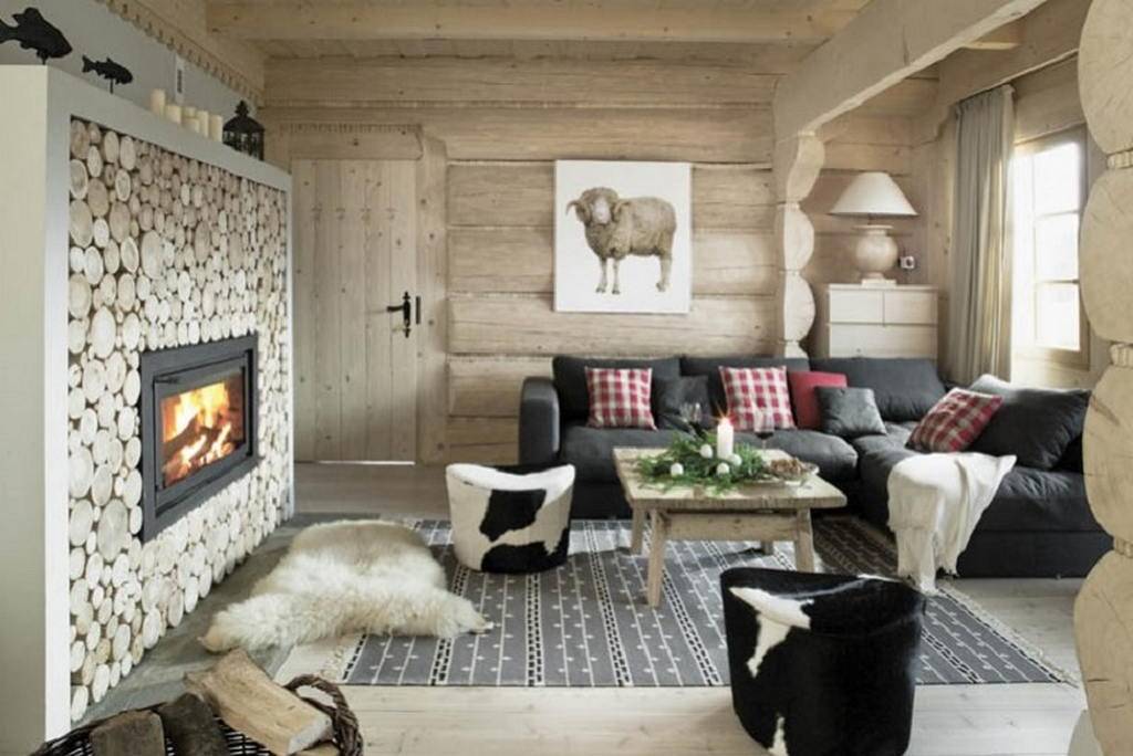 - приветствуется использование камина или его имитации. Располагать его рекомендуется в зоне отдыха, там же следует использовать оленьи рога, шкуры и шерстяной ковер;