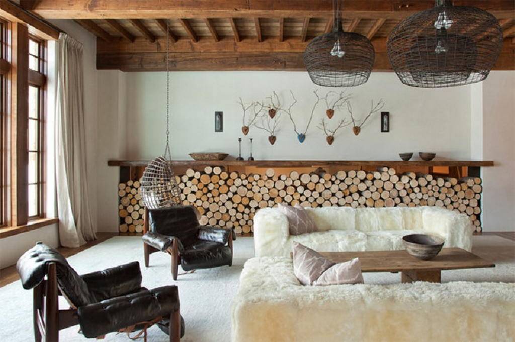 Если вы не намерены приобретать новую мебель, можно задрапировать имеющиеся стулья и диваны грубой тканью из льна, других эко-материалов или мехом.