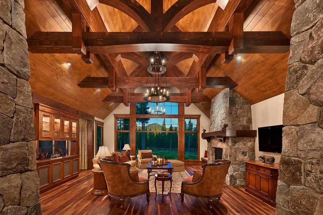 Стены зашиты деревом, чаще всего панелями из бруса. Зона вокруг камина декорирована природным камнем с минимальной обработкой.