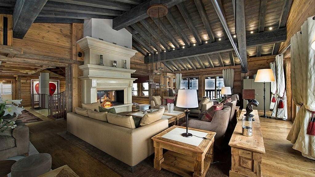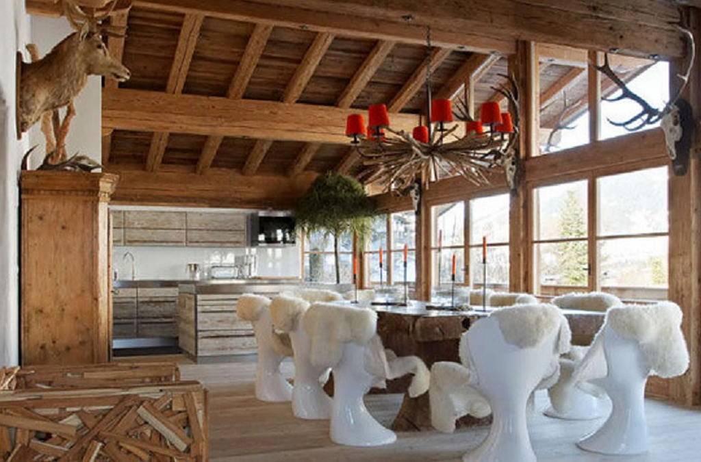В то же время прямые линии, угловатость, причудливые формы кресел и столиков в стиле второй половины 20 века гармонично ложатся на фон в стиле шале.