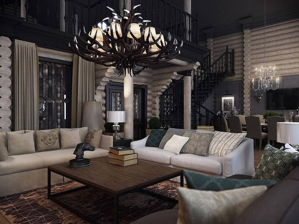 Центральная люстра зачастую привлекает массивностью, простотой формы, и в то же время величием. Обычно она сделана из металла и имитирует подсвечники. Нередко люстры украшаются оленьими рогами.