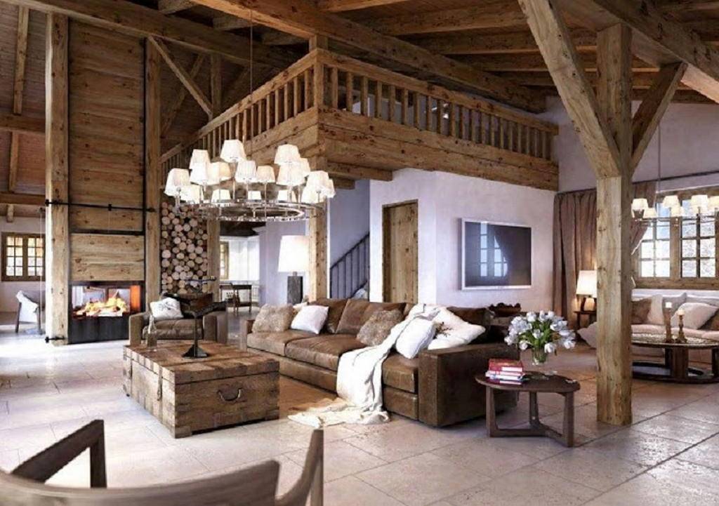 Потолочные навесные конструкции обнажены. Деревянные круглые или квадратные балки, в виде колонн подпирающие потолок, хорошо смотрятся в очень просторных помещениях.
