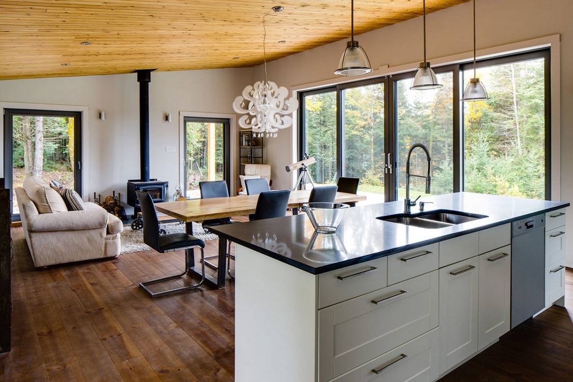 Белый шале интересен своей универсальностью. Оформление кухни площадью 10 квадратных метров сдержанное и лаконичное.