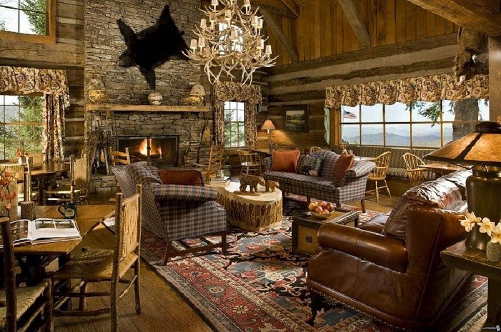 Они могут быть и ручной работы, вышитые. Главный критерий при выборе тканей — полная натуральность материала. Оконные занавески или шторки тоже обязательно должны быть только из натуральных тканей. Никакой синтетики: только кашемир, лен, хлопок, шерсть. Подчеркнуть индивидуальность стиля можно натуральными меховыми шкурами животных, которые можно постелить на пол или повесить на стену. Можно покрыть диван классическим пледом в клеточку или каким-нибудь грубым пледом, на стенах развесить охотничьи трофеи. Неплохо будут смотреться на полу всевозможные вязаные шерстяные дорожки или ковры. Не помешают на стенах старые фотографии и картины в деревянных рамках. Отличным дополнением будут фетровые подушки на стульях, вышитые крестиком.