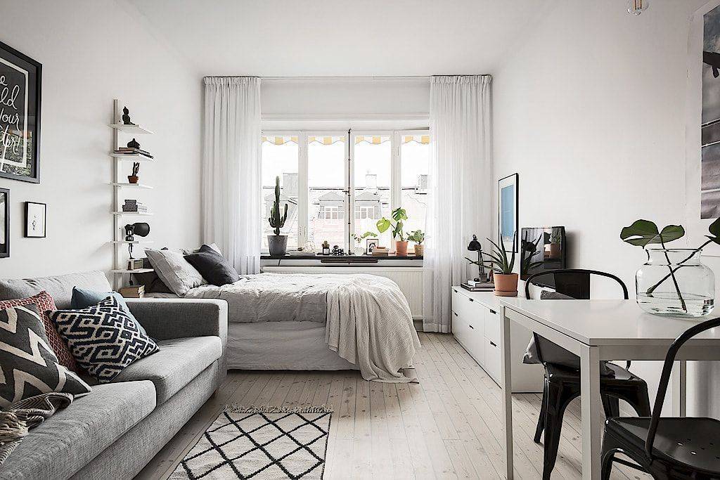 Ну и, наконец, когда все проблемы с зонированием решены, стоит задуматься о том, в каком стиле будет оформлена ваша квартира. Чаще всего студии оформляются в скандинавском или минималистичном стиле с использованием ярких акцентов. Мы подобрали несколько примеров светлых красивых студий для вдохновения с учетом уже усвоенных нами правил.