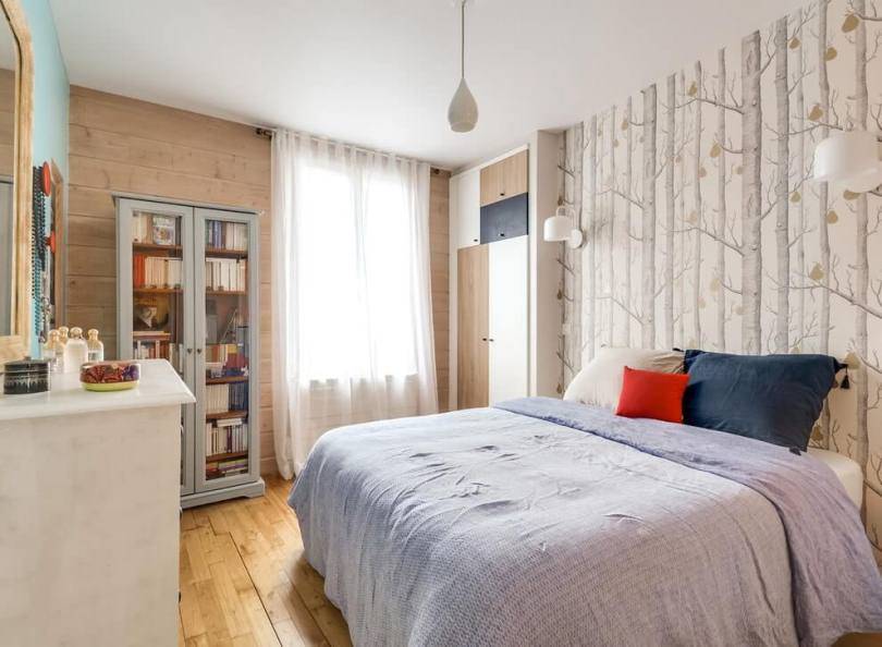 В этой квартире, находящейся в Московской области, проживает искусствовед Маргарита Петерсон. Площадь спальни 17,7 м. Стены оклеены обоями тёмно-серого оттенка – хозяйке хотелось создать более камерную атмосферу в просторном помещении. За счёт белого обрамления окна и мебели комната кажется светлее.