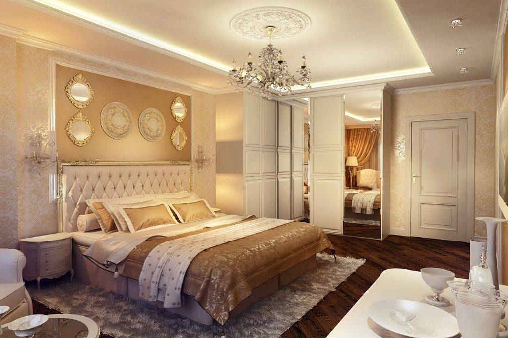 3. Отделка потолка должны выполнять не только эстетическую функцию, но и визуально делать спальню выше. Для этого потолок должен быть глянцевым. Удачным решением будет объемное покрытие. Такого эффекта можно достичь с помощью зеркальной натяжной пленки, обрамленной гипсокартоном.