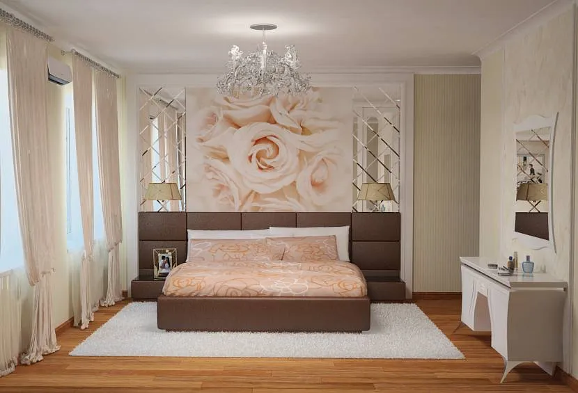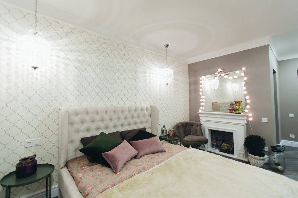 При оценке помещения необходимо учитывать его специфику, к примеру, наличие ниши, выступов, входа в балкон и т. д. Для большой спальни подходят фактурные обои, темные тона мебели, массовые люстры и разнообразие декоративных элементов.