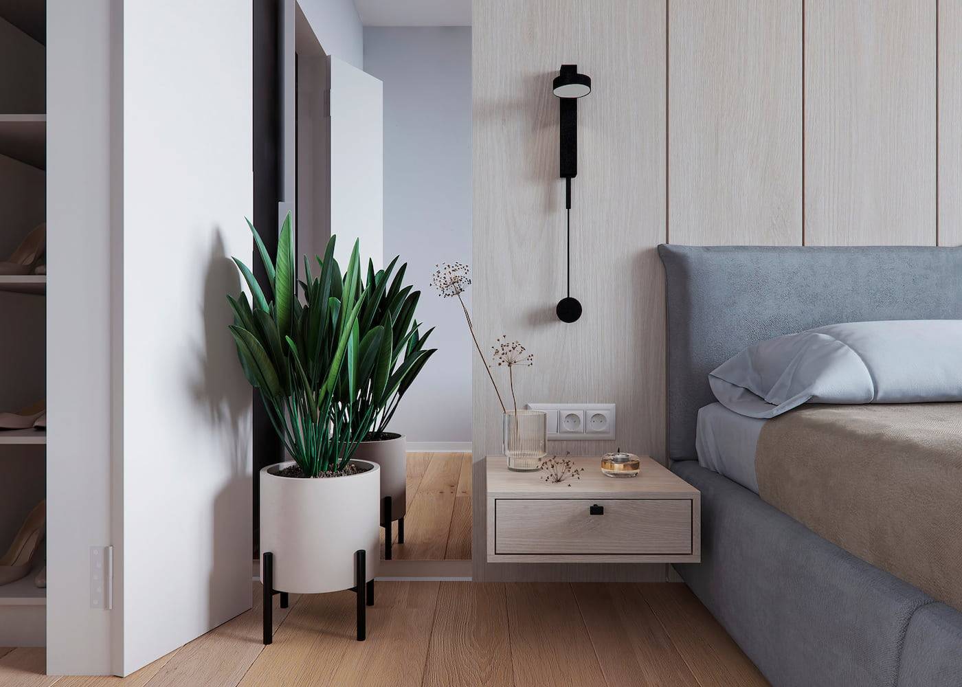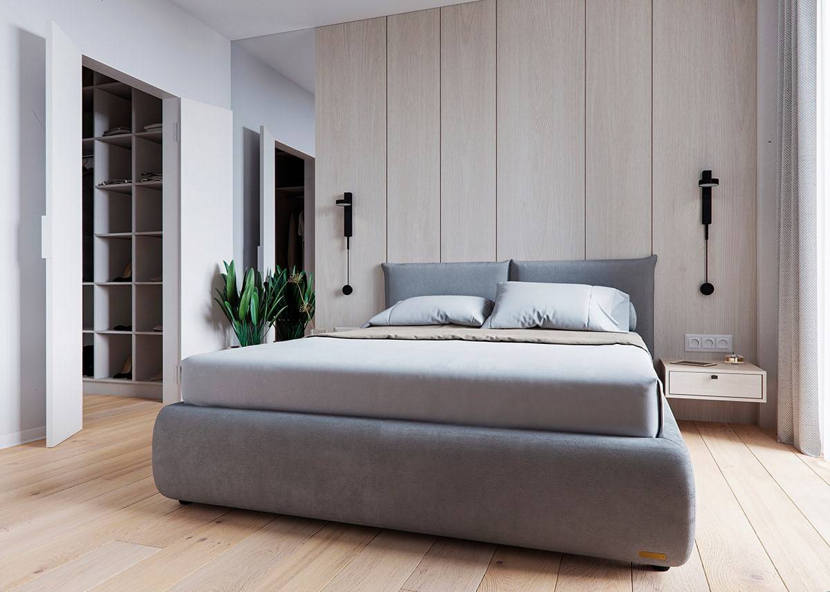 2. Изголовье и стена одного цвета, но разной насыщенности. Например, темно-серая кровать рядом со светло-серой стеной, синяя кровать рядом с синей и т.д.