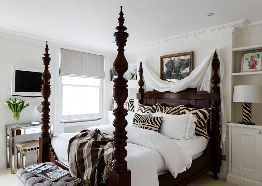Спальни, выполненные в этническом стиле (например, африканском), прекрасно гармонируют с темными тонами спальни и эффектными фактурами кожи.