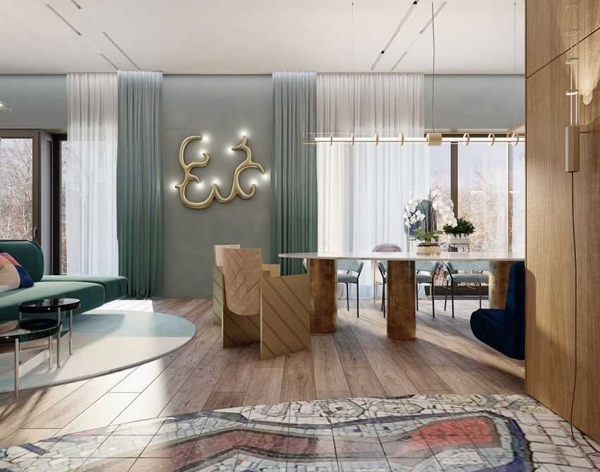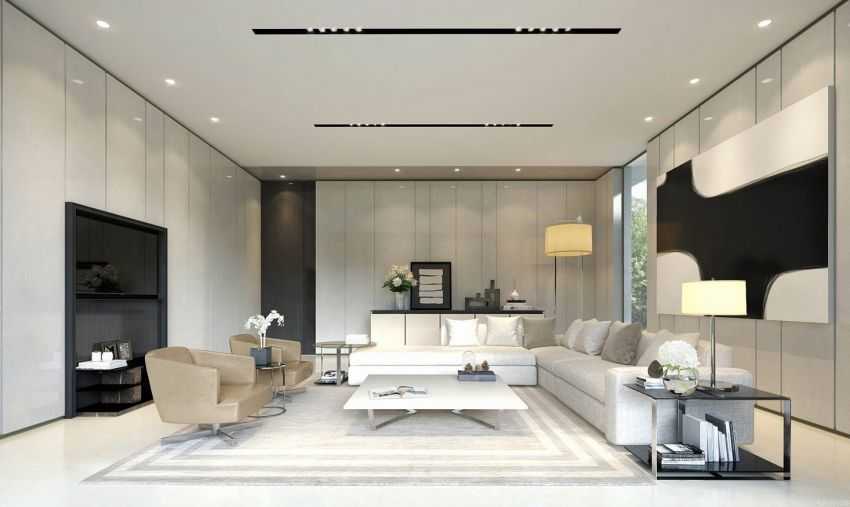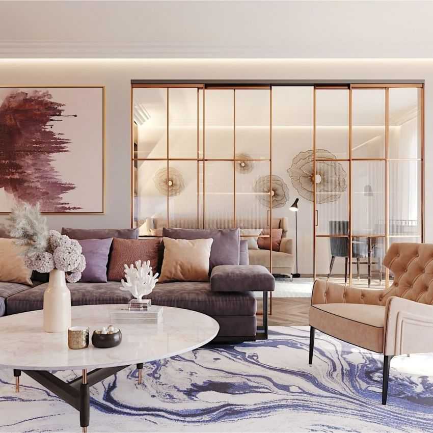 В интерьере гостиной 2020 года очень важно зонирование. В ней можно выделять зону для отдыха, маленькую столовую, кабинет и место для развлечений