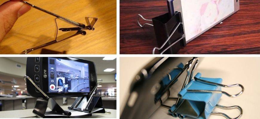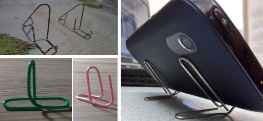 Самый простой способ. Для него потребуется всего лишь 2 канцелярские скрепки, которые сгибают. Металл с проволокой надежно зафиксируют смартфон и не согнутся под его весом.