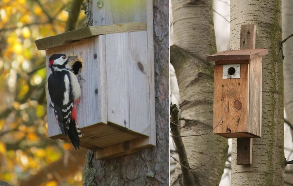 - синичник – отверстие летка 3,5 – 3 см, дно 10 х 10 см, высота 30 см, размещается аналогично скворечнику;