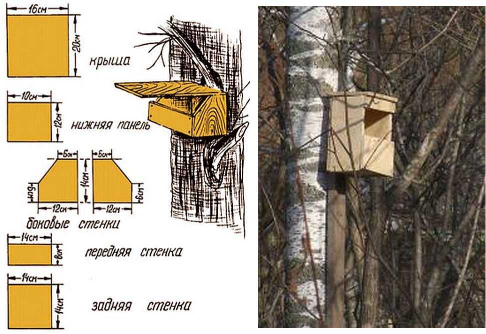 - мухоловочник – 3-х сантиметровый леток, днище 10 х 10 см, высота 15 см, крепится в 2 м от земли;