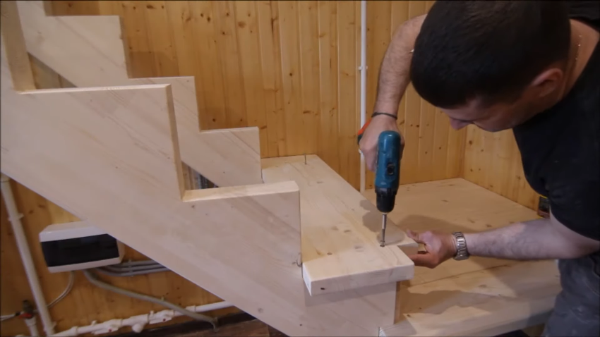 После фиксации подступенков устанавливаются заранее фрезерованные ступени, длина которых должна превышать расстояние между парой крайних косоуров на 1-2 см. Ширина элементов должна быть на 2-3 см больше гребеночного выступа. Крепление ступеней к подступенкам и косоурам осуществляется на саморезы, шляпки которых должны быть утоплены в дерево.
