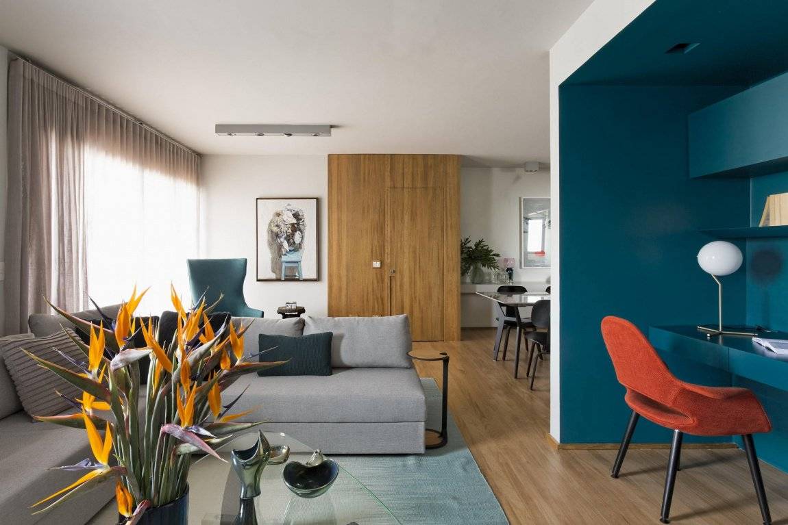 Вдоль стен меблировку располагают очень редко – сейчас популярно зонирование. Стеллажом в совмещенной кухне-гостиной, студии отделяют спальную зону, барной стойкой – кухню, душевой кабинкой в совмещенном санузле отделяют туалетный столик от унитаза.