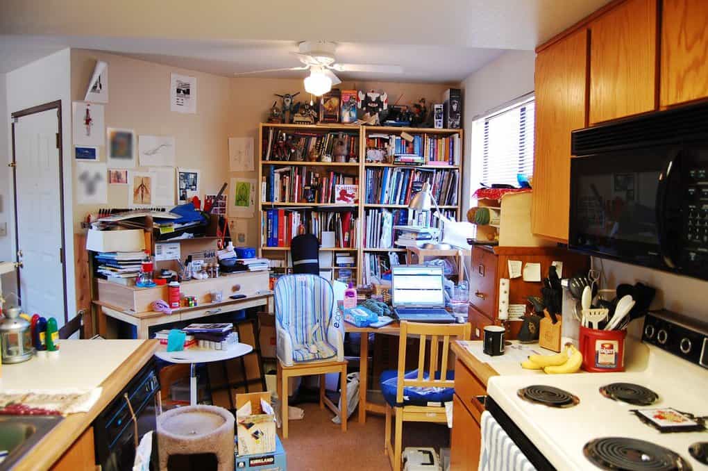 Компьютерные столы с открытыми полками, кухонные рейлинги, кажущиеся такими удобными, микрополочки, выполняющие якобы функцию декора — места, которые захламляются очень и очень быстро, как бы вы не старались поддерживать там порядок. И весь хлам в таких случаях будет на виду, он испортит первое впечатление о квартире, да и вообще будет съедать пространство. Согласитесь, что находиться в захламленной квартире — приятного мало. так что лучше избегать таких вот открытых полок, рейлингов, а хранить все мелкие предметы или, например, кухонную утварь за закрытыми дверцами и в специальных системах хранения.
