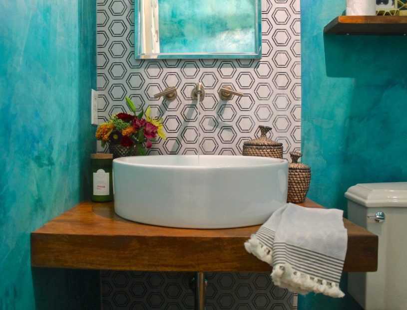 В ванной комнате будет уместно смотреться отделка из декоративной штукатурки, если этот материал защитить влагостойким лаком. На рынке стройматериалов встречается масса вариантов такого декора: различные по текстуре и цвету, такие штукатурки могут выступить «соло» или же стать партнёром для любого типа отделки, описанного выше.