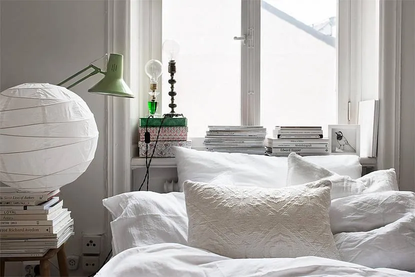 Если взглянуть на подоконник, отбросив стереотипы, то немедленно выясняется, что его можно превратить в чрезвычайно удобную и функциональную систему хранения. Идея особенно актуальна в маленькой спальне: за спинкой найдётся место для ламп, книг и множества полезных мелочей, и вы обойдётесь без прикроватных тумбочек.