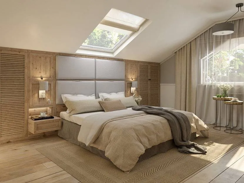 Один из самых эффектных способов обустроить спальню – это устроить её на мансардном этаже. Благодаря наклонному потолку, такая комната всегда выглядит романтично, а кровать, установленная под окном, позволит наслаждаться звёздным небом.