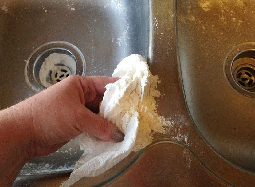 - Через несколько минут насухо протереть тканью из натурального волокна (лучше всего хлопка). Если этого не сделать, то на мойке из нержавеющей стали могут остаться некрасивые потёки.
