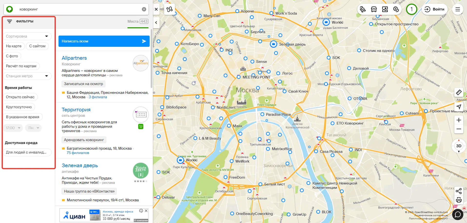 - Найти коворкинги в нужном районе — искать удобно в 2ГИС. Изучить и сравнить их предложения. Например, в феврале в Москве работало 115 коворкингов.