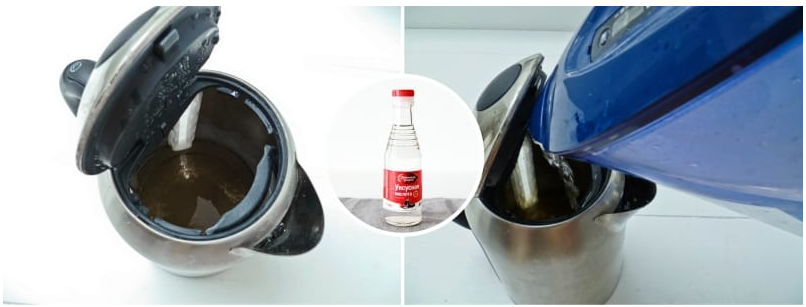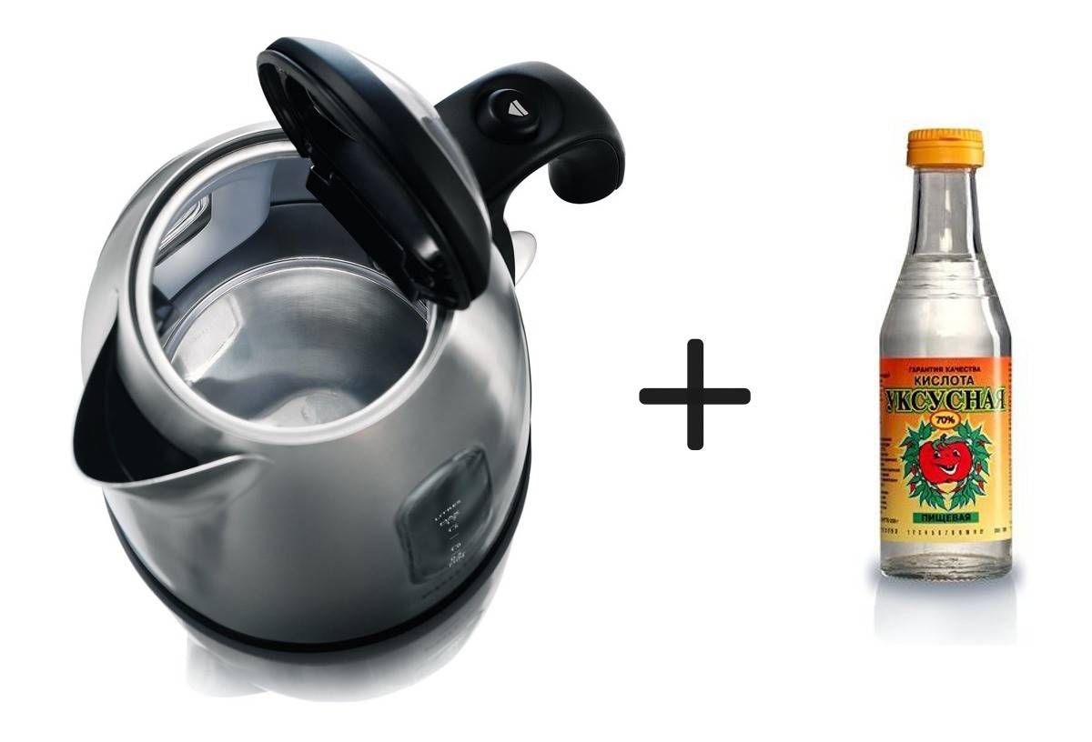 На обычный электрический чайник емкостью 1,5-2 л понадобится 2 стакана 6% столового уксуса, который нужно долить водой до максимальной отметки. Чтобы очистить чайник, уксус нужно прокипятить и оставить на несколько часов, как и лимонную кислоту. Только имейте в виду: запах уксуса на кухне будет очень сильный. Избавиться от него потом можно будет интенсивным проветриванием.