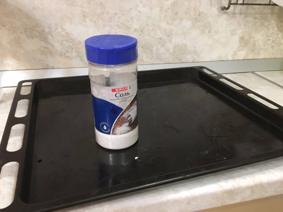 Противень, где равномерно рассыпается соль, ставится на полчаса в разогретую до 100 градусов духовку. После остывания соль счищается скребком пластиковым или силиконовым, и противень протирается влажной тряпкой или губкой.