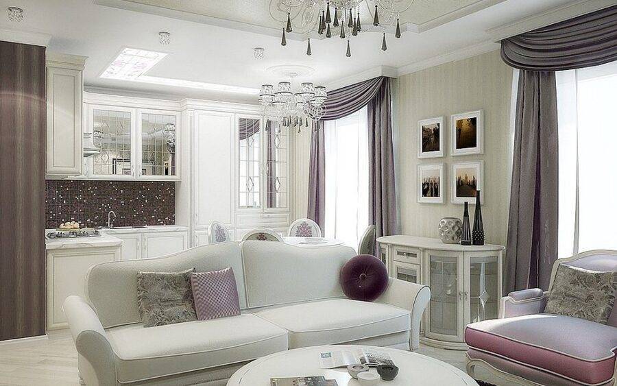 Прованс. Подойдут абсолютно любой тип штор. Главное избежать большое количества драпировок и пышности. Шторы лучше всего выбирать светлых оттенков, которые бы максимально пропускали дневной свет