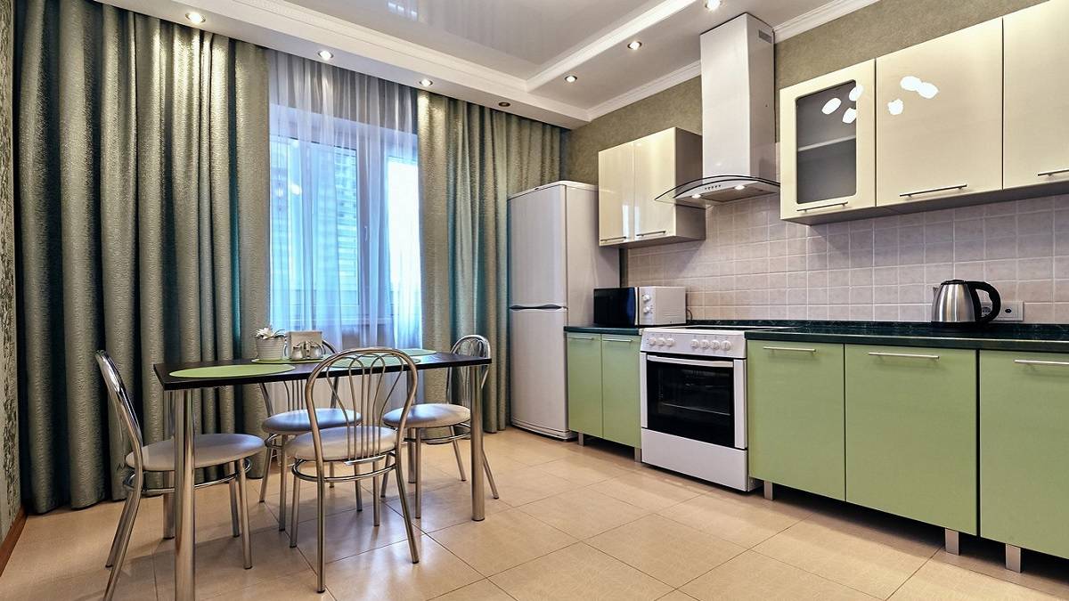 Приглушенный травяной оттенок занавесок и декоративных подушек совпадает, а вот фасады гарнитура отличаются по тону. Но благодаря одной гамме, это различие не нарушает цветовой баланс в помещении.
