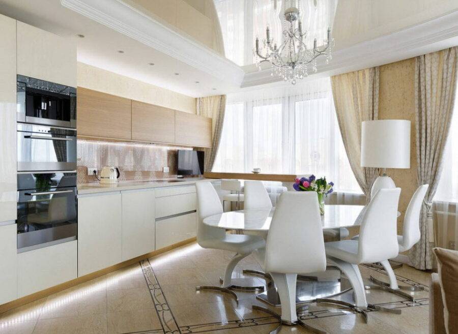 Подобный вариант будет прекрасно смотреться в гостиной или спальни, а вот для кухни это будет серьёзной ошибкой, ведь здесь больше, чем где-либо скапливается пыли, копоти и грязи.