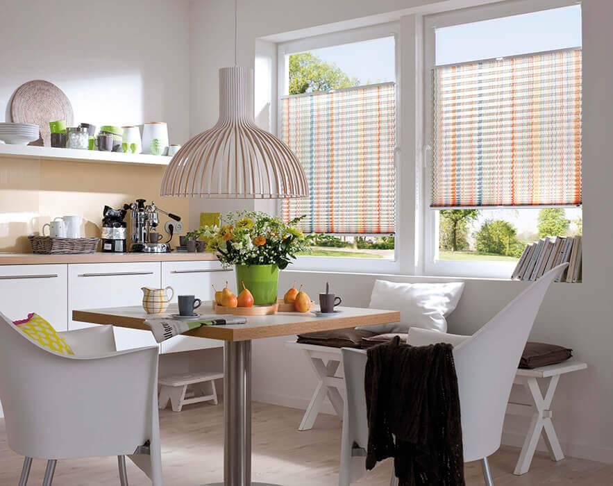 Римские. Представляют собой регулируемое полотно ткани. Легко опускаются и поднимаются. При этом образовывают красивые горизонтальные равномерные складки. Прекрасный способ легкого и быстрого регулирования поступления дневного света на кухню. Хорошо подходят под любой стиль интерьера.