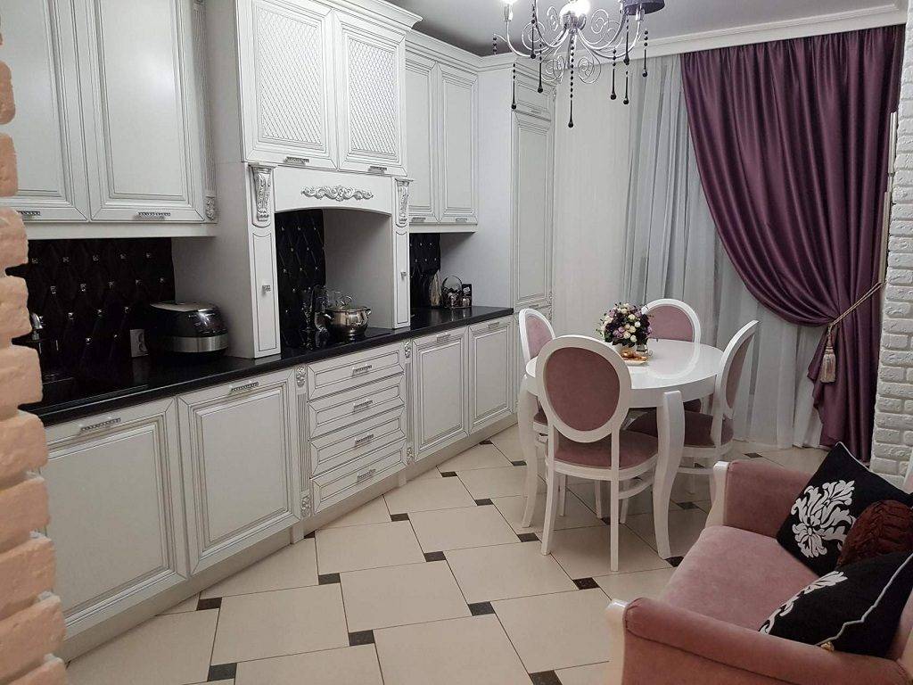 Для уже сложившего интерьера с декоративными излишествами можно подобрать тонкие простые занавески с элегантными драпировками из тюля или органзы. Чтобы сделать декор более выразительным, можно его дополнить ламбрекенами и подхватами. Ламбрекены, кстати, на классической кухне могут быть сколько угодно сложными — они не мешают функциональности кухни, а помещение приобретет роскошный, соответствующий выбранному стилю вид.