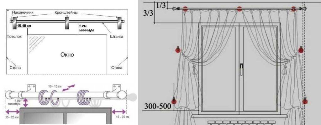 Но при желании отдаленность от потолочного перекрытия можно увеличить или уменьшить, так как данная величина не имеет никакого технического значения, главное, чтобы изделие смотрелось в комнате органично. Намного важнее правильно определить расстояние держателя занавесок по высоте до окна. Оно должно быть таковым, чтобы можно было без проблем открывать и закрывать окно, вне зависимости от того, в каком положении находятся шторы.