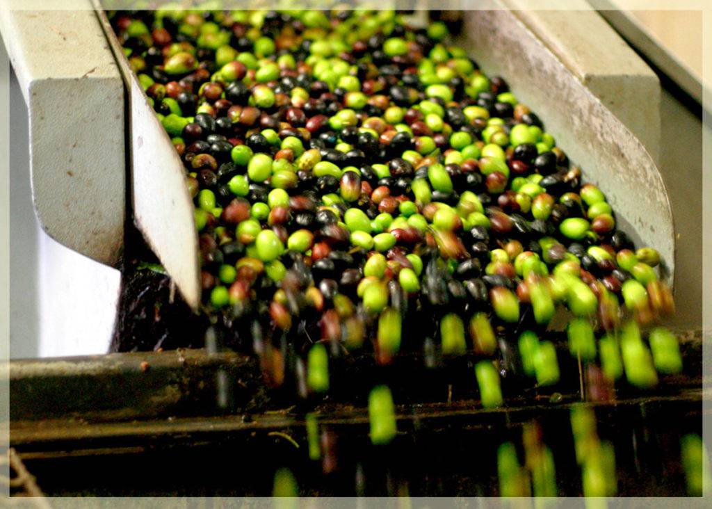На заводе с помощью погрузчика оливки высыпают в приемное отделение, и в режиме замкнутого цикла происходит процесс прессования. Сначала удаляются попавшие листья и ветки, затем оливки тщательно промываются и поступают на измельчение.