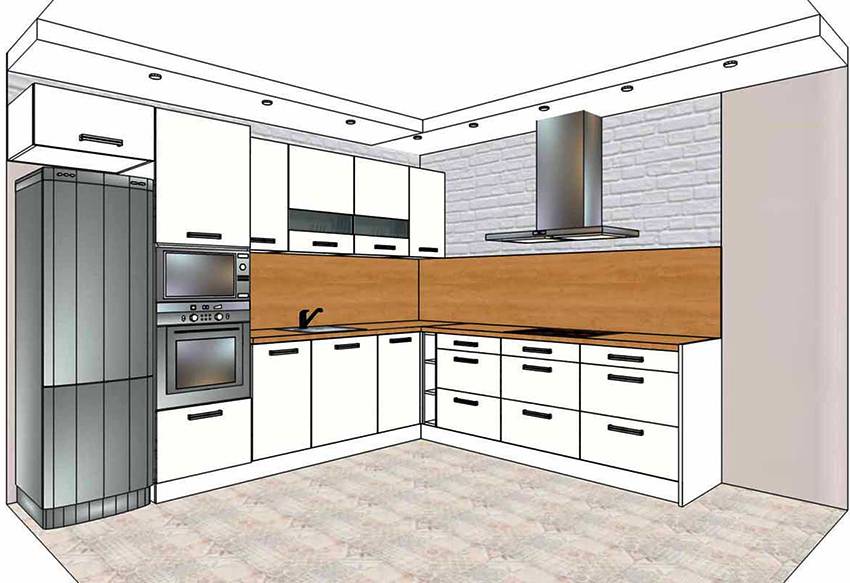Г-образная. Актуально применять в просторных кухнях площадью 12-15 м², которые отличаются прямоугольной или квадратной формой. В этом случае две функциональные зоны рабочего треугольника располагаются возле одной стены, а третья выносится на перпендикулярную стену. Большинство фото угловых проектов кухонь демонстрируют, что в незадействованном углу ставят обеденную группу, зачастую с угловым диваном.