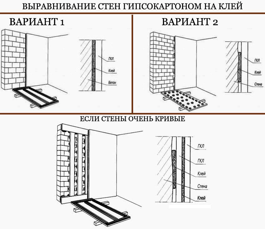 Чтобы приклеить ГКЛ к стене, используются разные методы, в зависимости от состояния поверхности.