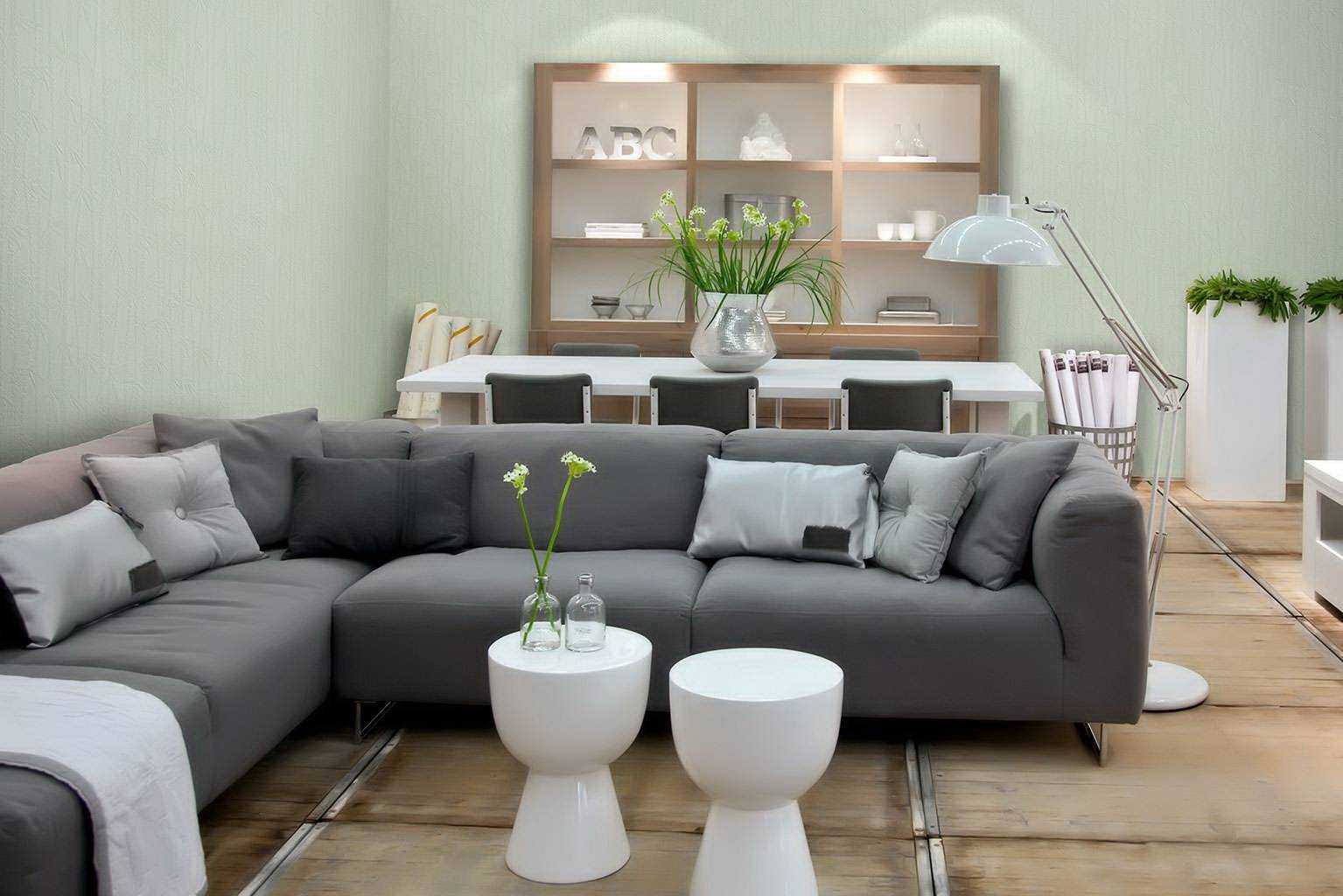 Угловой диван ставят вдоль длинной стены, в большом зале можно использовать как элемент зонирования