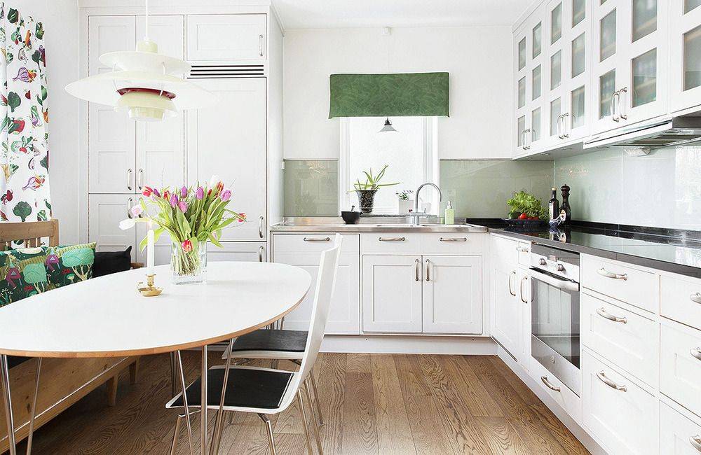 Место приготовления пищи и обеденный стол должны находиться на максимально возможном удалении друг от друга. Минимальное расстояние допускается около метра, так как в ином случае затрудняется свобода передвижения по и так стесненному помещению. Будет великолепно, если для обеденной зоны приобрести современную раскладную мебель, которая явно освободит часть пространства помещения. Даже если просто сделать обеденный стол откидным, то это тоже существенно расширит хозяйке свободу ее действий.
