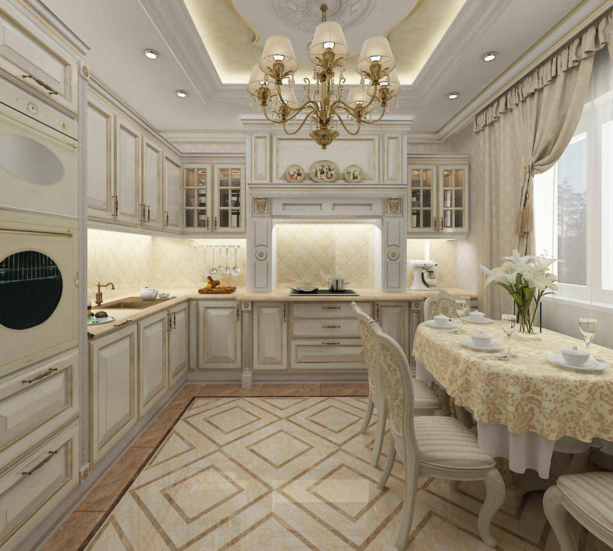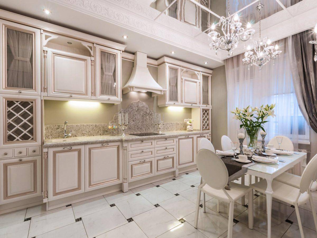 - Классический интерьер выглядит роскошно и элегантно. При его воплощении необходимо придерживаться правил симметрии в расположении предметов, использовать натуральные материалы, лепнину, позолоту и др. Идеально впишется в обстановку кухонный гарнитур из тёмного дерева простой формы, но украшенный резьбой, накладными декоративными элементами, фурнитурой из бронзы или латуни.