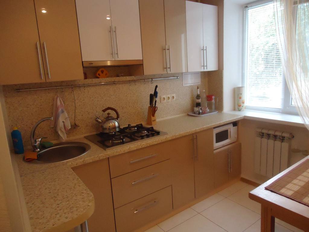 Обустройство маленькой кухни начинается, конечно, с правильно расставленной мебели. Кухонный гарнитур предпочтительнее всего купить буквой «Г». Также приемлем вариант расстановки кухонного гарнитура по прямой линии. Плюсом первого варианта расположения будет большее количество мест для хранения и более уютная обстановка. Плюсом второго варианта является максимальная экономия пространства.