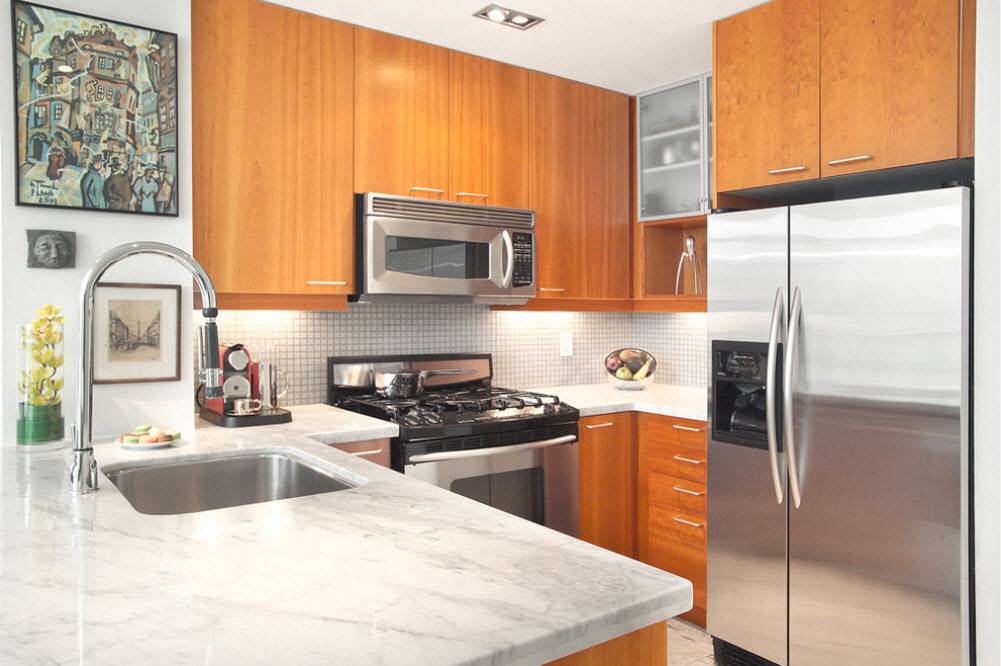 Дизайнеры советуют использовать максимально высокие шкафы с глубокими нишами, в которых легко можно спрятать некоторые из указанных предметов, доставая их по необходимости. Разместить на рабочей поверхности можно электрочайник и кофеварку, как наиболее часто используемые устройства.
