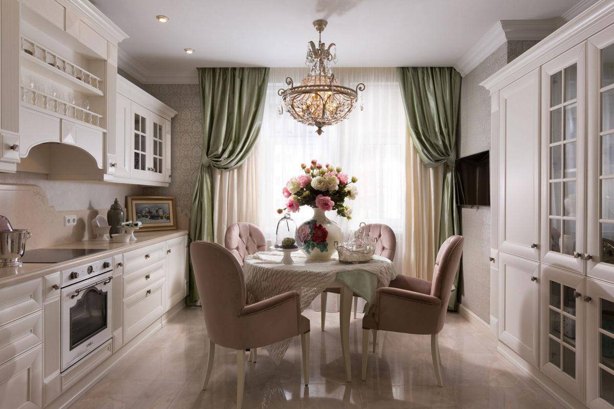 Еще раз напомним, уют на кухне в мелочах, поэтому к выбору аксессуаров нужно подходит особо тщательно. Это касается, в первую очередь, декорирования оконного проема. Удачным решением будут полупрозрачные воздушные шторы, длина которых доходит до подоконника. Их цвет должен сочетаться с оттенком стен. Такие шторы идеально подойдут под классическое оформление.
