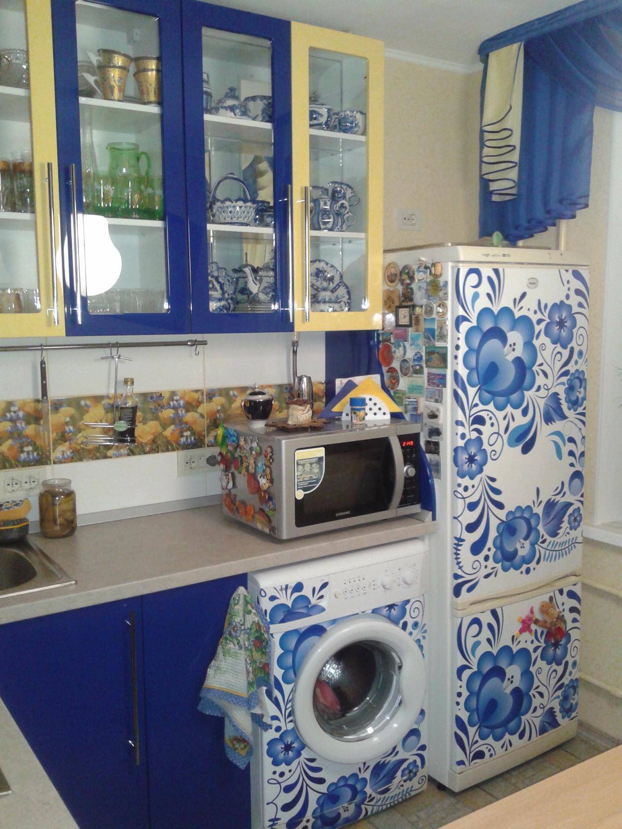 Обновить фасады кухонного гарнитура помогут декоративные наклейки, изображающие посуду, овощи или фрукты. Эффектно преобразит шкафы самоклеящаяся пленка. Поскольку такая отделка быстро теряет первоначальный вид, ее придется менять раз в год. Удобнее использовать матовые фасады – они не создают световых бликов и более комфортны для человека.
