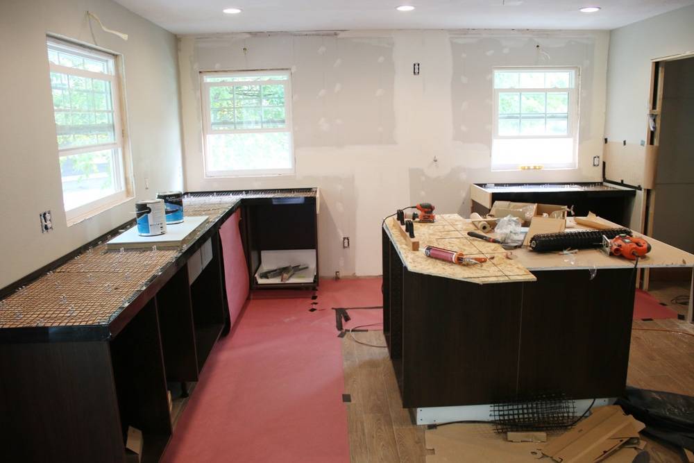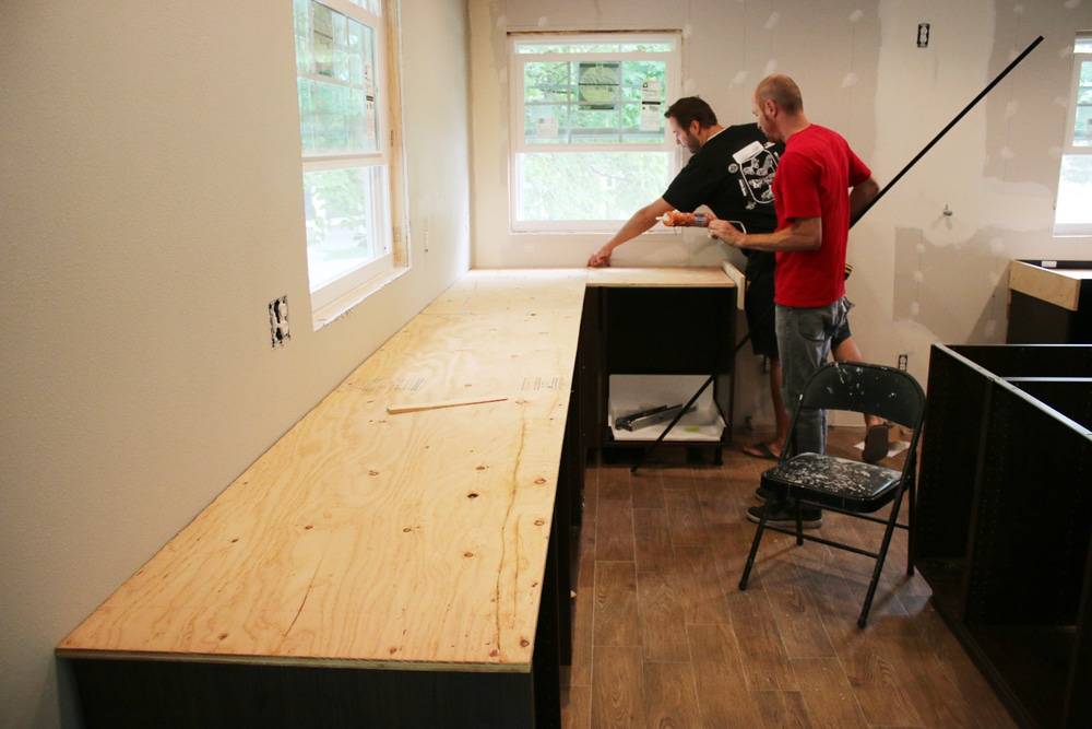 При отливке по месту на верх шкафов саморезами крепят нижнюю часть будущей столешницы. Её вырезают из влагостойкой фанеры. Края могут свисать за стенки мебели. Чтобы сформировать красивый торец, применяют специальные пластиковые бортики. Есть много вариантов, из чего сделать окантовку торца. Подойдёт алюминиевый уголок, рельефный бордюр для кафеля. Можно просто оштукатурить видимый торец фанерного основания. Вес бетонной плиты стараются максимально облегчить. К основанию приклеивают бруски из пенопласта. Если заливают несколько слоёв, на низ добавляют керамзитовые гранулы.