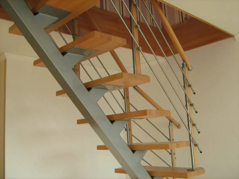 - Изделия из профтрубы могут опираться на один или два-три параллельных косоура, поворотную площадку изготавливают из дерева.