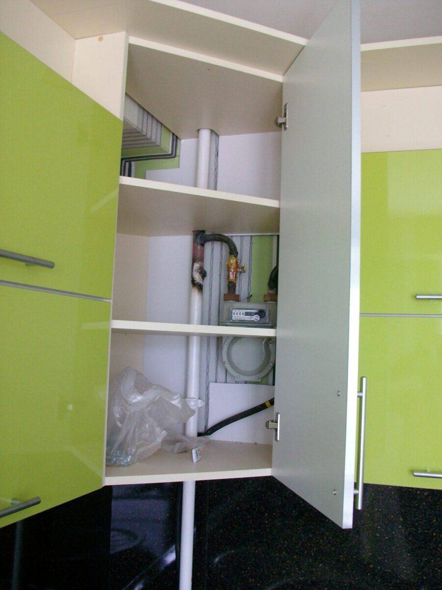 Для маскировки труб газовой системы, внутри шкафа должна быть достаточная степень вентиляции, поэтому в шкафу ставится решетчатый экран либо делаются точечные отверстия в незаметных местах. Эти вещи нельзя заставлять банками и прочей утварью.