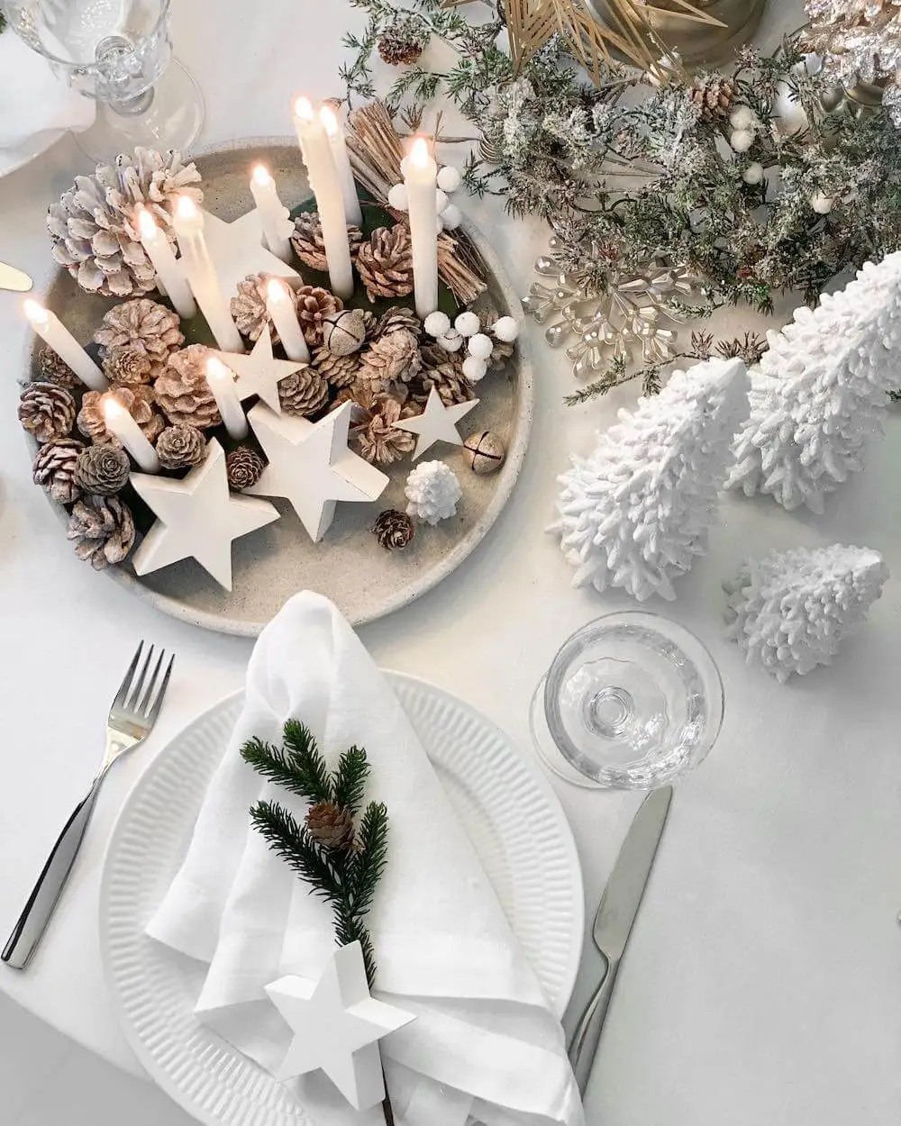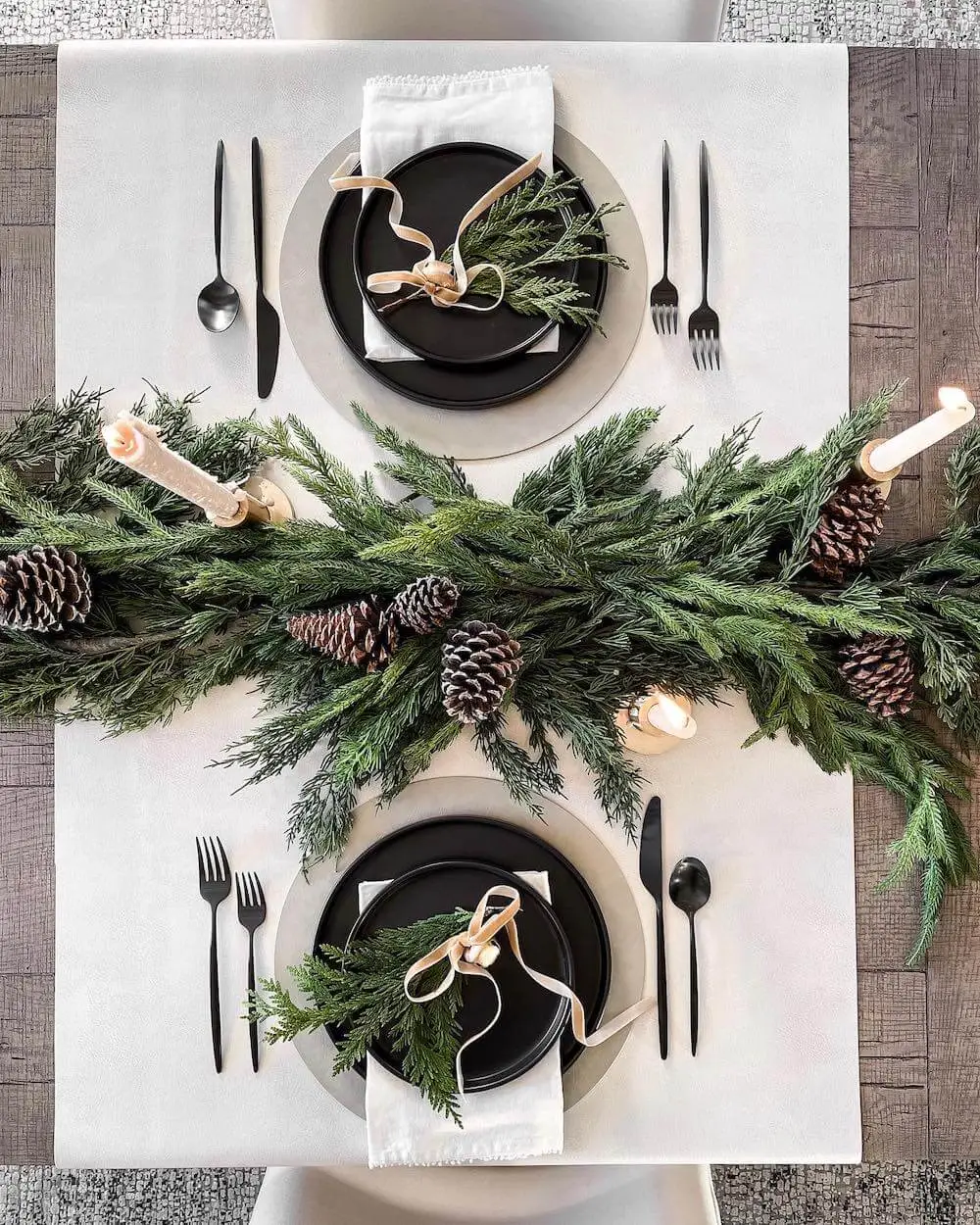 Разбавить декор можно минималистичными подсвечниками и небольшими вазочками с хвойными веточками. Допустимо добавить салфетки с растительным орнаментом.