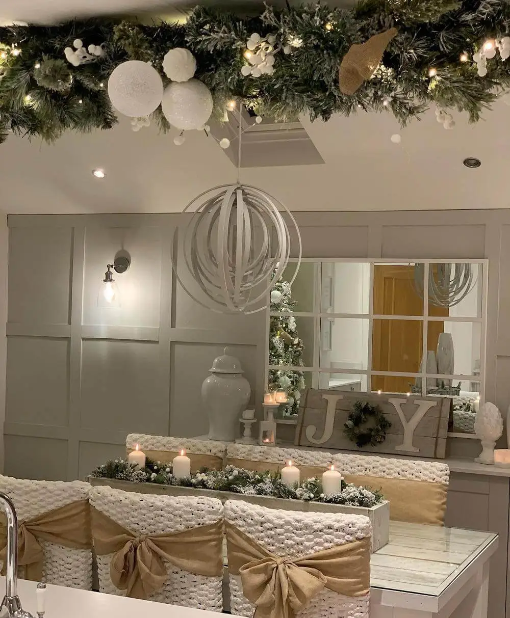 - украсить стулья. Можно надеть обычные белые чехлы или завязать ленты, с подвешенными на них шишками, ёлочными игрушками и статуэтками.