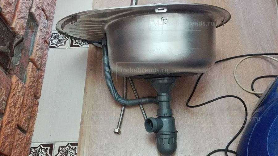 - Вставляем мойку в выпиленный контур и проверяем правильность ее размещения и установки сифона и смесителя.